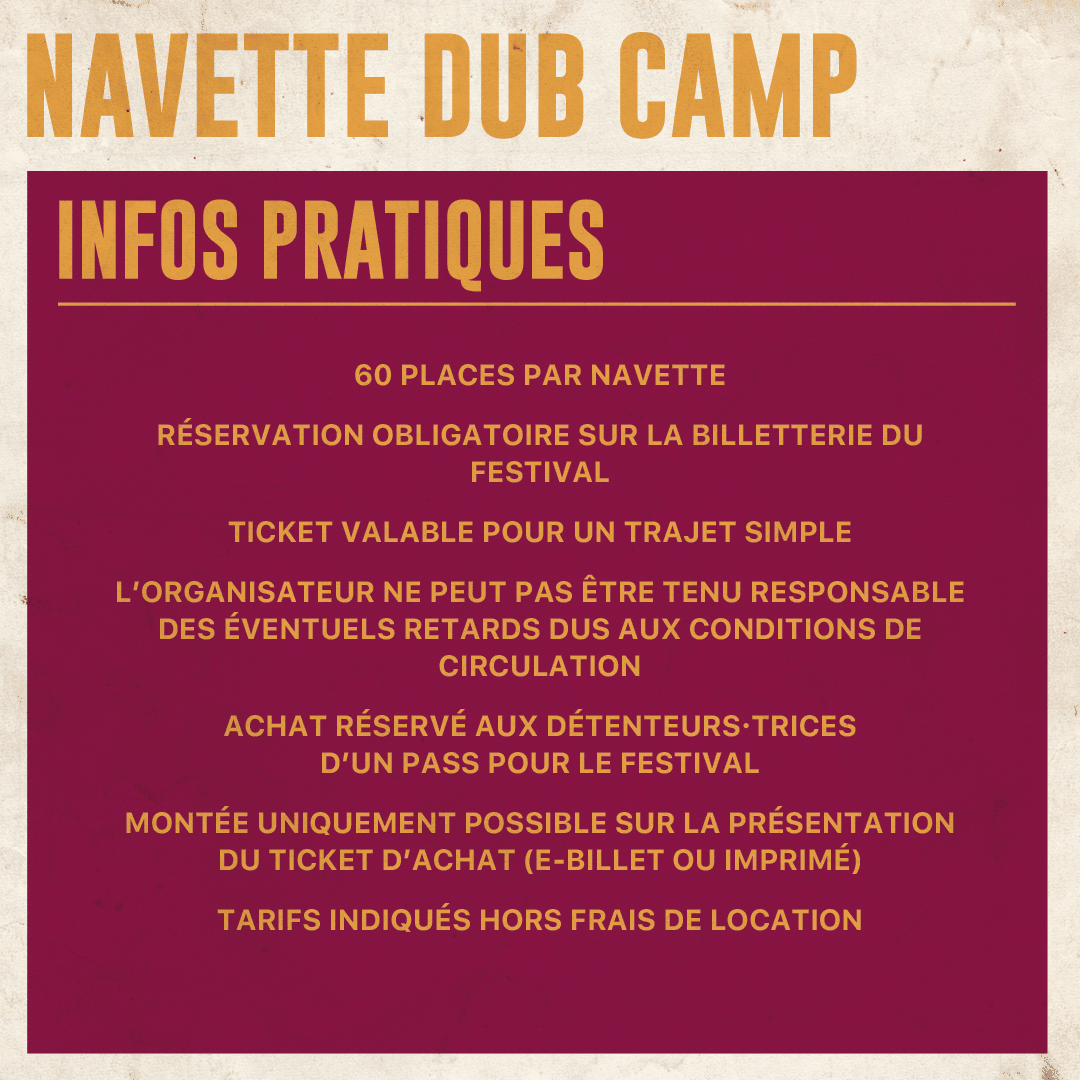 Les navettes disposent de 60 places. La réservation est obligatoire sur la billetterie du festival. Un ticket est valable pour un trajet simple. L’organisation ne peut pas être tenue responsable des éventuels retards dus aux conditions de circulation. Achat réservé aux détenteur·ices d’un pass pour le festival. Montée uniquement possible sur présentation d’un ticket valable (e-billet ou imprimé) Les tarifs indiqués sont hors frais de location.